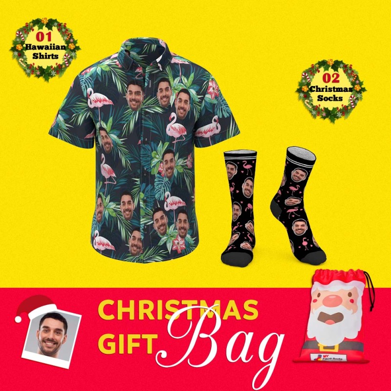 Christmas Gift Bags Custom Face Hawaiian Shirts And Socks Set For Him Flamingo Flowers And Leaves
