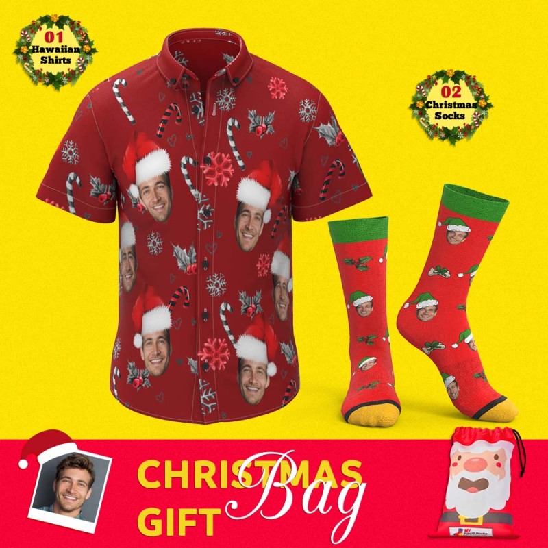 Christmas Gift Bags Custom Face Hawaiian Shirts And Socks Set For Him Santa Claus With Candy Canes