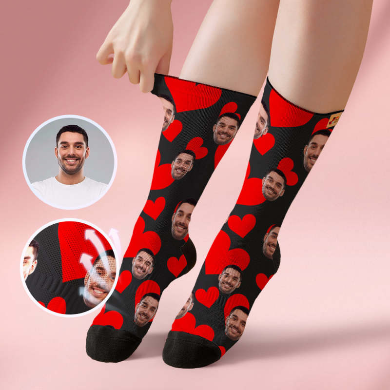 Custom Breathable Face Socks Online Preview Add Pictures Red Hearts Valentine's Day Gifts for Couple
