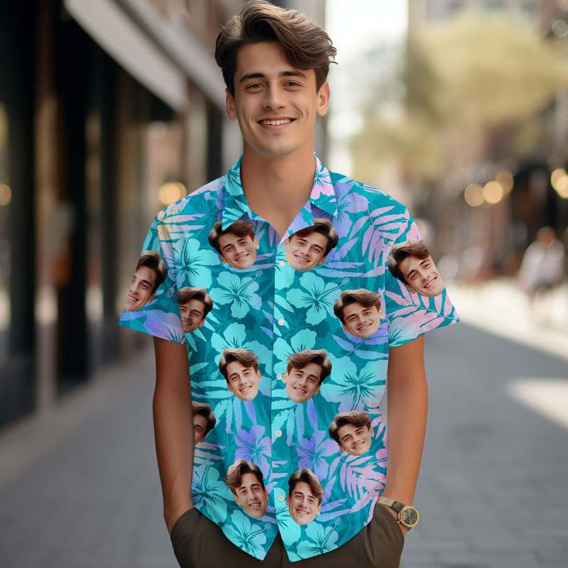 Custom Face Hawaiian Shirt Art Hawaiian Blue Leaves Hawaiian Shirt