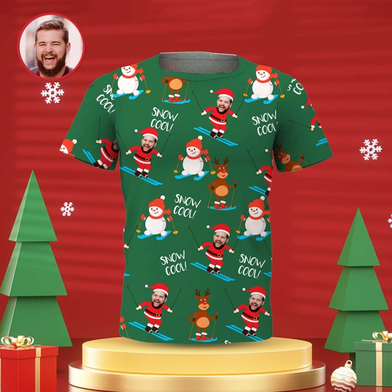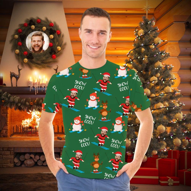 Custom Face Men's T-shirt Personalised Photo Green Santa T-shirt - Snow Cool