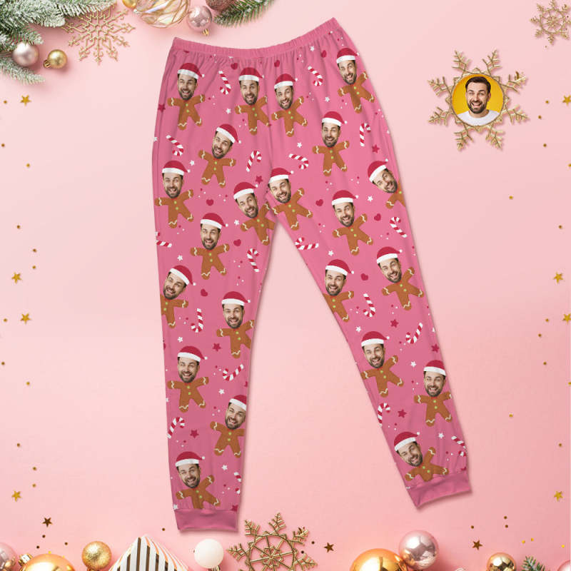 Custom Face Pink Pajamas Personalised Round Neck Gingerbread Christmas Pajamas For Women And Men