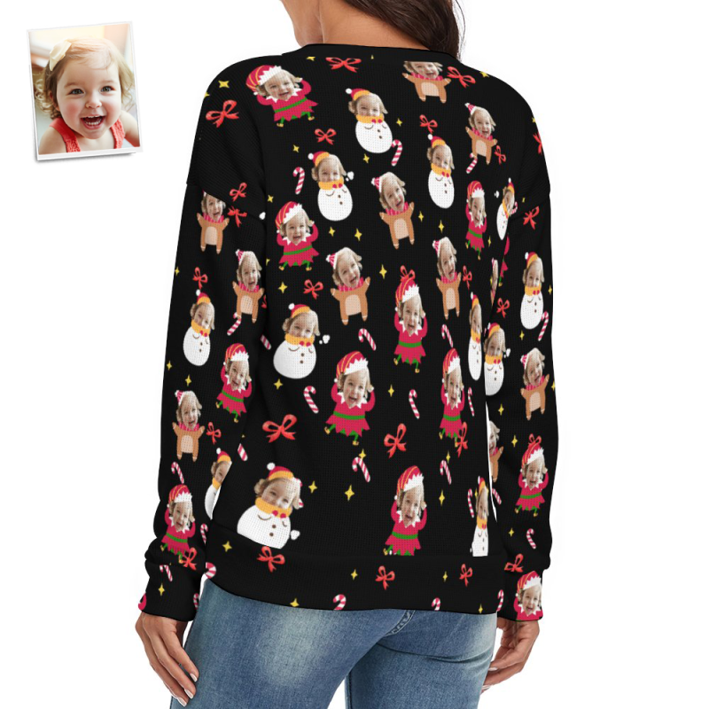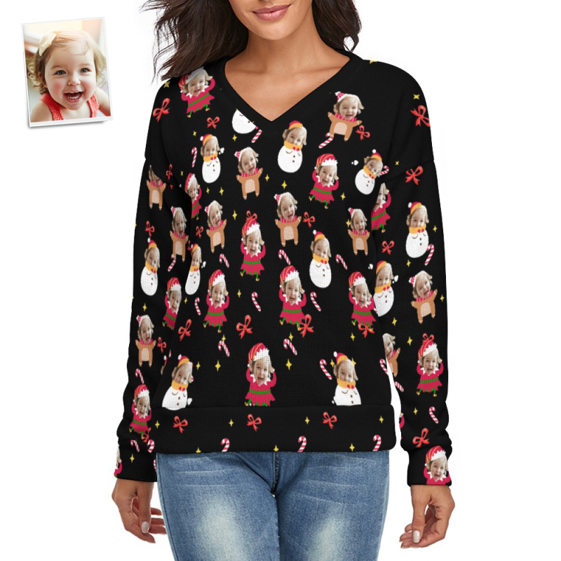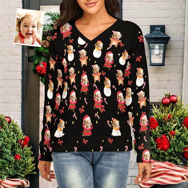 Custom Face Women V-Neck Christmas Sweater Lively And lovely Spandex Comfortable