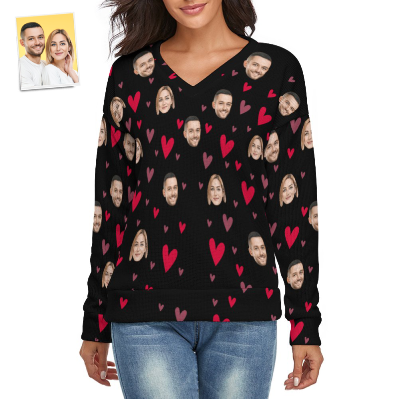 Custom Face Women V-Neck Sweater With Little Heart Couple Theme Spandex Comfortable