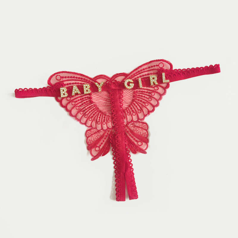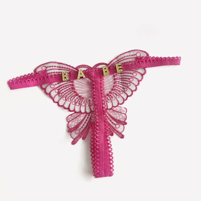 Custom Lace Hollow Butterfly Sexy Low Waist Panty with jewelry Crystal Letter Name Open Cut Thong Underpants Women's Underwear