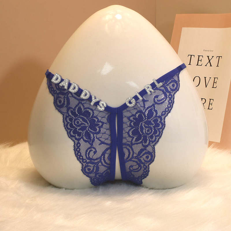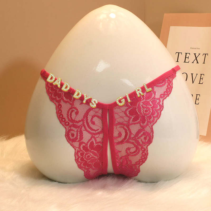 Custom Lace Sexy Panty with jewelry Crystal Letter Name Open Cut Thong Underpants Women's Underwea