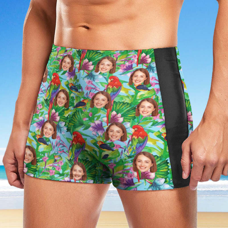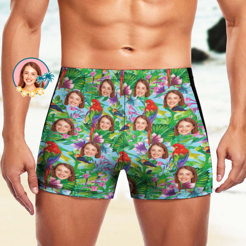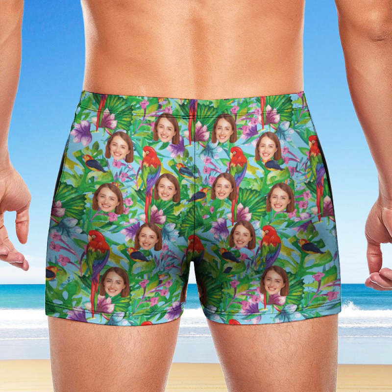 Custom Men's Swim Boxer Shorts, Hawaiian Face Swim Trunks, Peseronalized Swim Briefs - Parrot