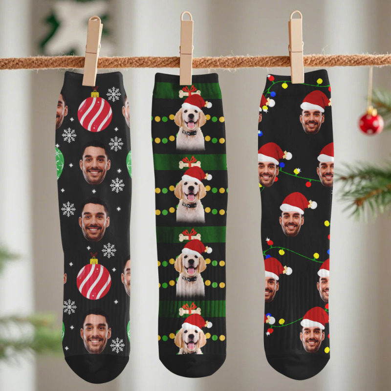 Custom Pet Christmas Socks Cute Pet Face Socks with Festive Fairy Lights Perfect Santa Gift