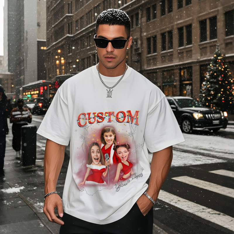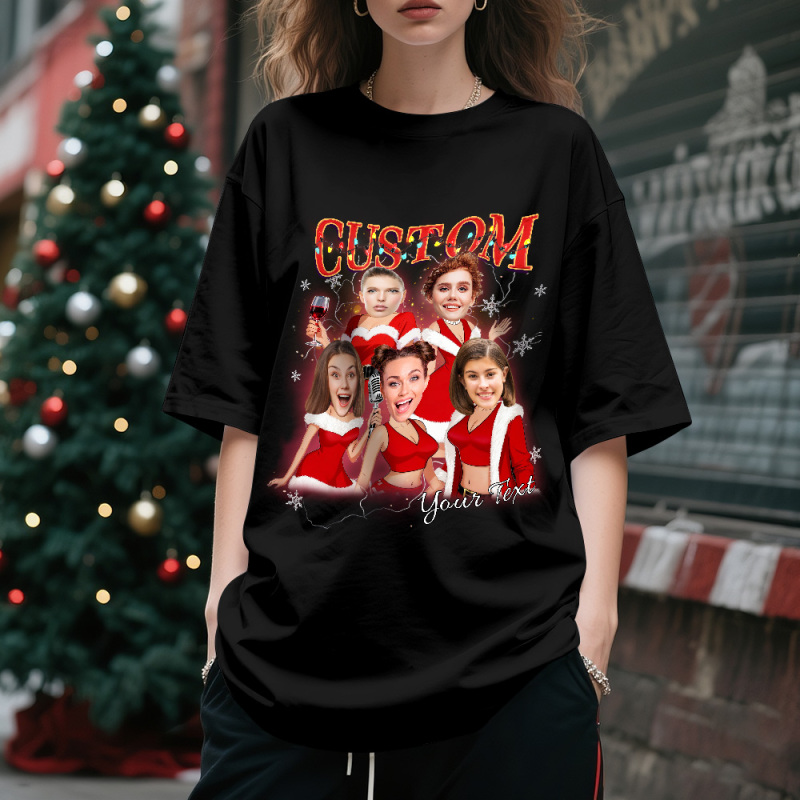 Custom Vintage Christmas T-Shirt with Photo Personalized Santa Light Shirt Funny Holiday Tee Gift for Family & Friends