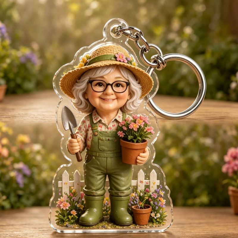 Celebrate the love of grandma with a custom garden-themed acrylic keychain. Upload a photo and transform it into a charming, soft-style character design inspired by gardening and nature.